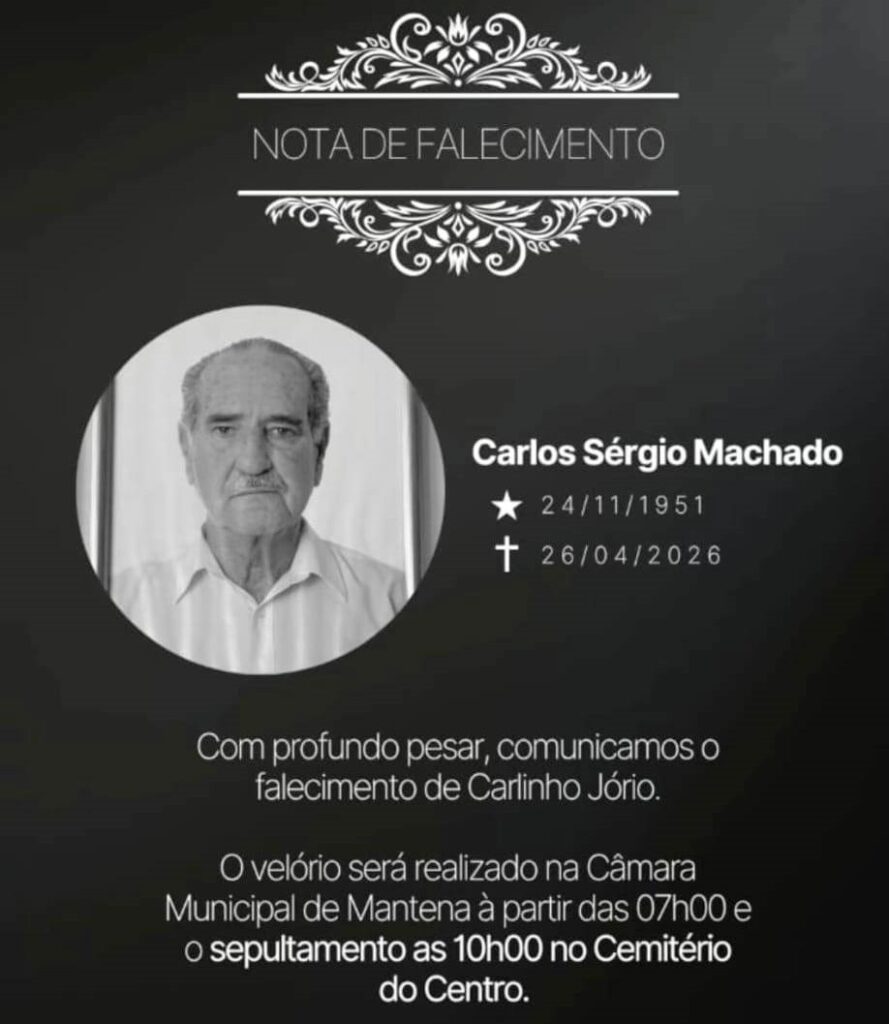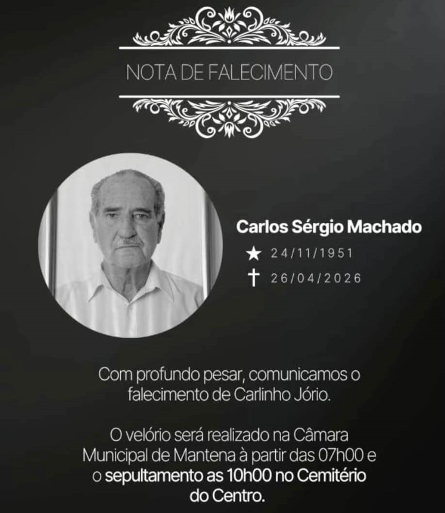 A Câmara Municipal de Mantena informou  que o velório do  advogado e funcionário  Dr. Carlos Machado, (1951-2026),  vai acontecer nas dependências do legislativo à partir das 7 da manhã desta segunda-feira, (27), e que logo após será o sepultamento às 10 horas da manhã no cemitério do Centro.