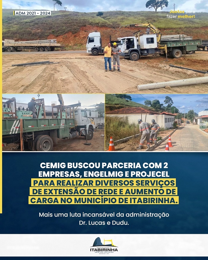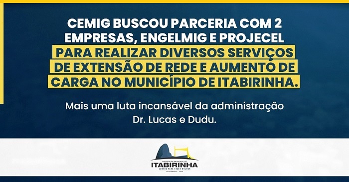 Não existem vitórias sem lutas, devido ao grande crescimento, emergente e diferenciado, do Município de Itabirinha no cenário regional uma das lutas incansáveis da administração Dr. Lucas Donadia e do Vice Dudu foi para que fosse realizado diversos serviços de extensão de Rede e Aumento de Carga no Município de Itabirinha, o que já começou e está acontecendo com a parceria da Cemig/ Engelmig /Projecel, mais uma vitória do trabalho e de suma importância para a continuação do crescimento do Município, uma vitória da luta incansável que a administração municipal dedica ao povo Itabirense.