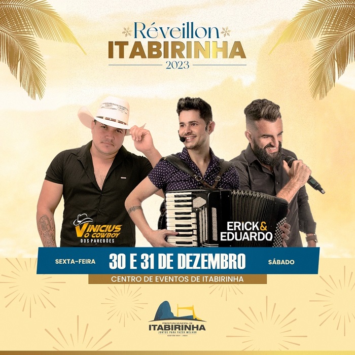 O Prefeito Dr. Lucas Donadia e vice Dudu convida população das cidades do Leste Mineiro e Noroeste Capixaba para participarem do Réveillon Itabirinha 2023 com shows de Vinicius – O cowboy dos paredões na sexta-feira, (30), e Erick & Eduardo no sábado, (31), com apresentações no centro de eventos de Itabirinha.