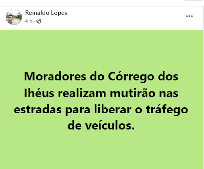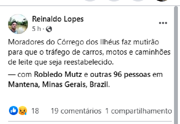 Depois que um comerciante pagou parte a capina do rio São Francisco na ponte do Fórum de Mantena e os moradores de Nazário terem realizado vaquinha para comprar cascalho e colocaram a mão na massa para arrumar a estrada principal do distrito agora chegou a vez dos moradores de Limeira que fizeram uma “vaquinha” para pagar uma maquina particular, segundo o vídeo existe um comentário que o prefeito não está satisfeito com o povo de Limeira porque não votou nos seus deputados na última eleição 2022.
