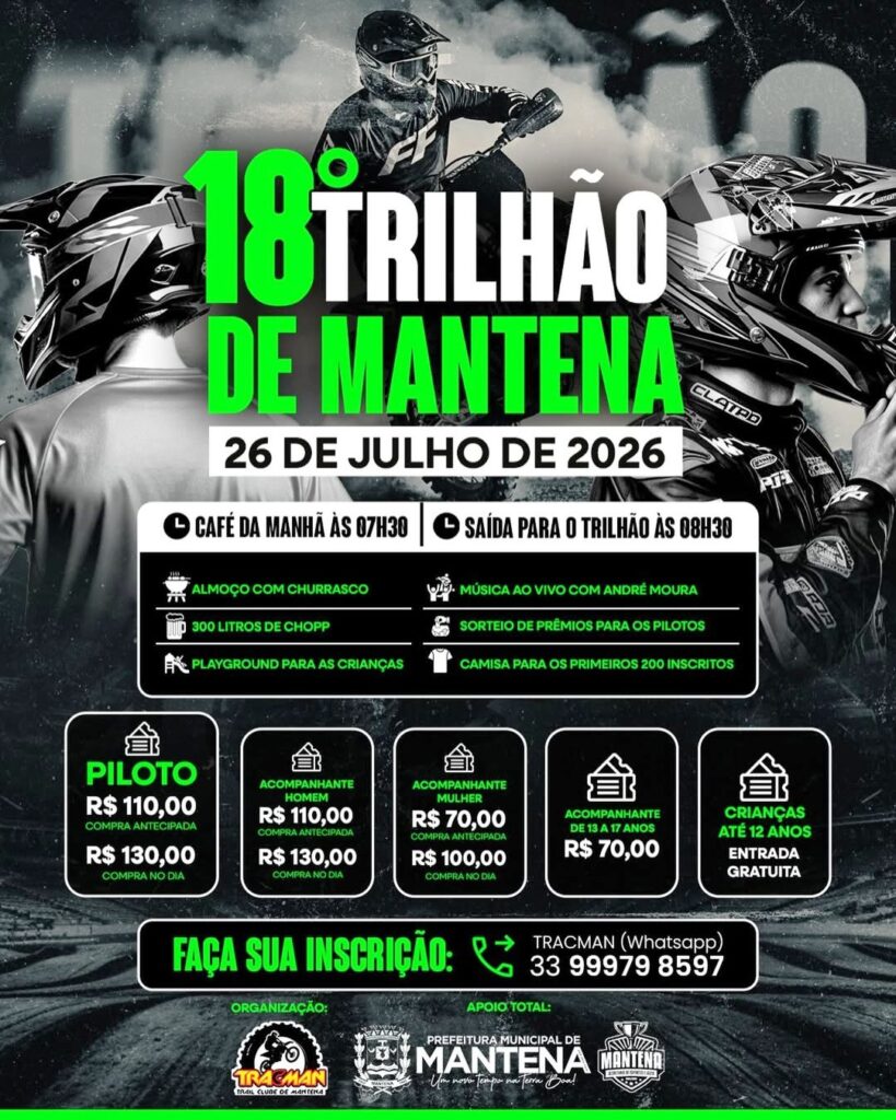 A espera está chegando ao fim para os amantes das duas rodas! Mantena já respira a poeira e a emoção de um dos eventos mais aguardados do calendário esportivo da região. No dia 26 de julho de 2026, a cidade será palco do 18º Trilhão de Mantena, um evento que já se tornou patrimônio dos trilheiros e que promete elevar o nível de adrenalina este ano.