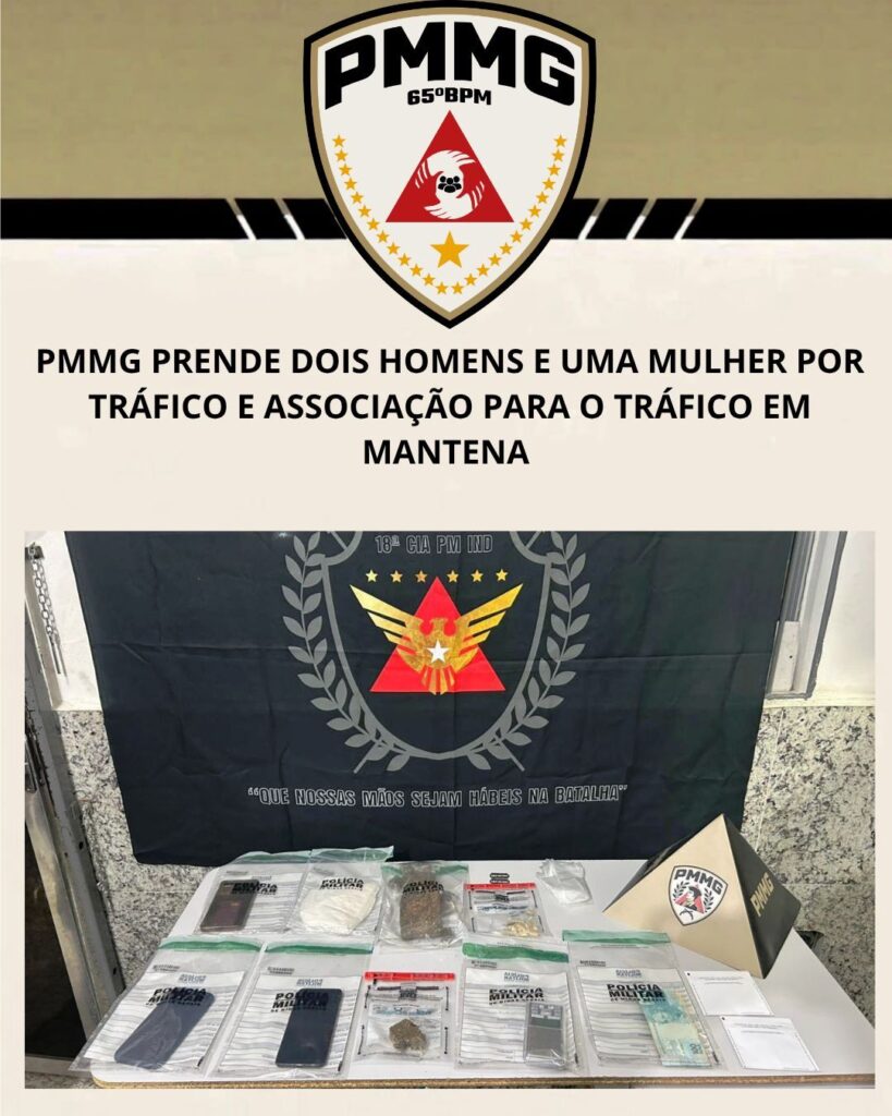 MANTENA – Uma denúncia anônima levou a Polícia Militar de Minas Gerais a desarticular um esquema de tráfico de drogas e associação criminosa na noite desta sexta-feira (27), no bairro Vila Nova. A operação, coordenada pelo Pelotão Tático Móvel da 18ª Cia PM Independente com apoio das guarnições do turno, resultou na prisão de três suspeitos e na apreensão de diversos materiais ilícitos.