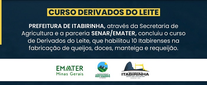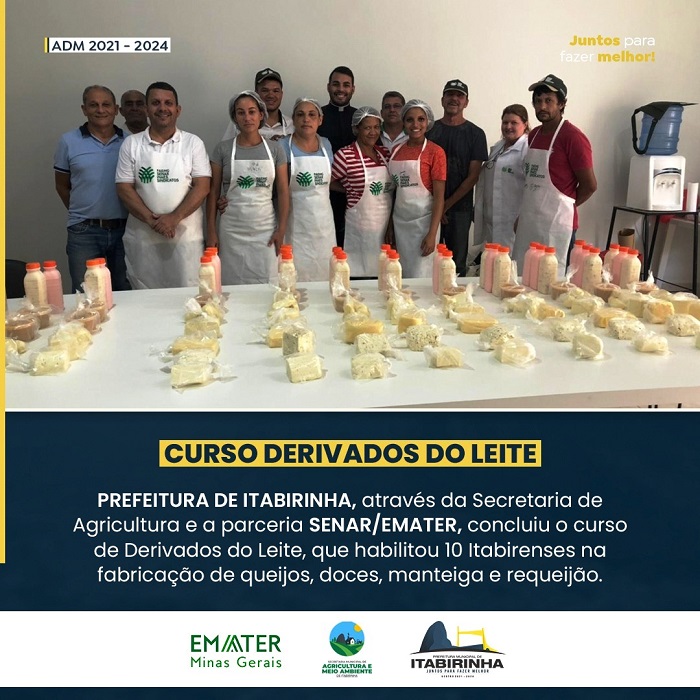 A administração do Prefeito Dr. Lucas Donadia e seu vice Dudu não para e continua proporcionando um novo tempo de conquistas para população de todo o Município , dessa vez a Secretaria Municipal de Agricultura em parceria com a EMATER, possibilitou o curso de “Derivados do Leite” e habilitou 10 novos “itabirenses” na fabricação de queijos, doces, manteiga e requeijão.