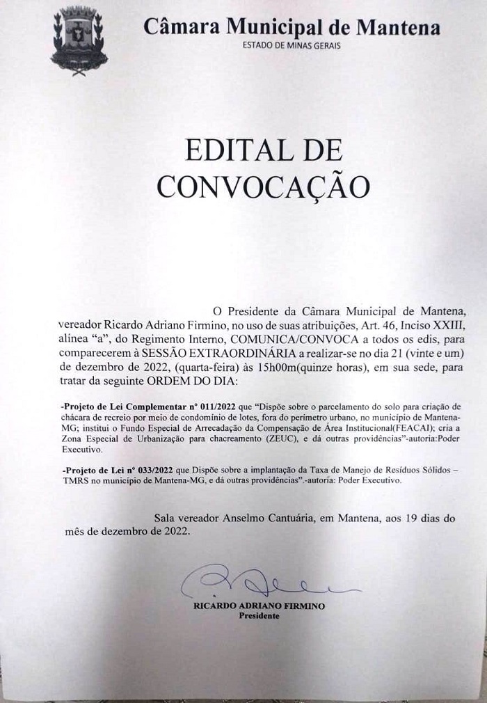Que Mantena está precisando de uma limpeza completa em todos os bairros da cidade é uma certeza, porém ninguém esperava pelo presente de Natal ofertado pelo Prefeito João Rufino no apagar das luzes de 2022 com a prerrogativa da Câmara Municipal em convocar uma “reunião extraordinária” para votar uma “Taxa de Manejo de Lixo” em “Regime de Urgência Especial”, na próxima quarta-feira, (21), às 15 horas.