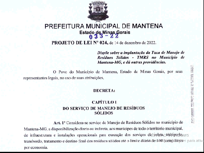clique aqui! PROTOCOLO – PL 033-2022 – Projeto de Lei Taxa de Manejo de Resíduos Sólidos – TMRS