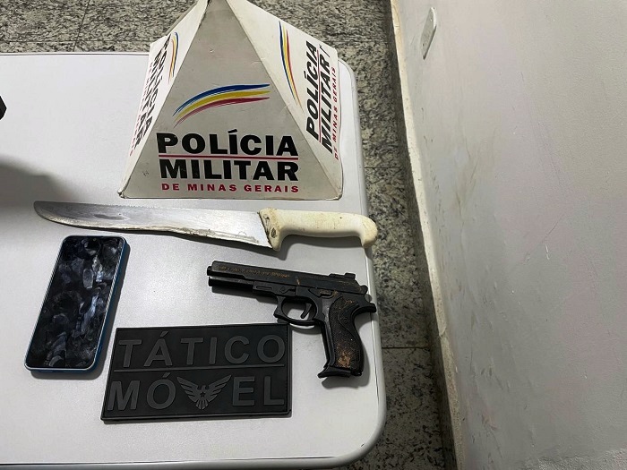 MATERIAIS APREENDIDOS: 01 motocicleta; 01 celular; 01 simulacro de arma de fogo; 01 faca e 01 caixa de entregador
