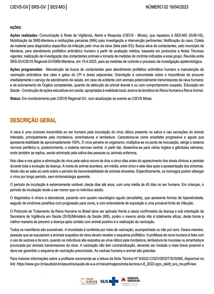 É causada pelo Vírus do gênero Lyssavirus, da família Rabhdoviridae. No Brasil no período de 2010 a 2020, foram registrados 38 casos de raiva humana, sendo que em 2014, não houve caso.