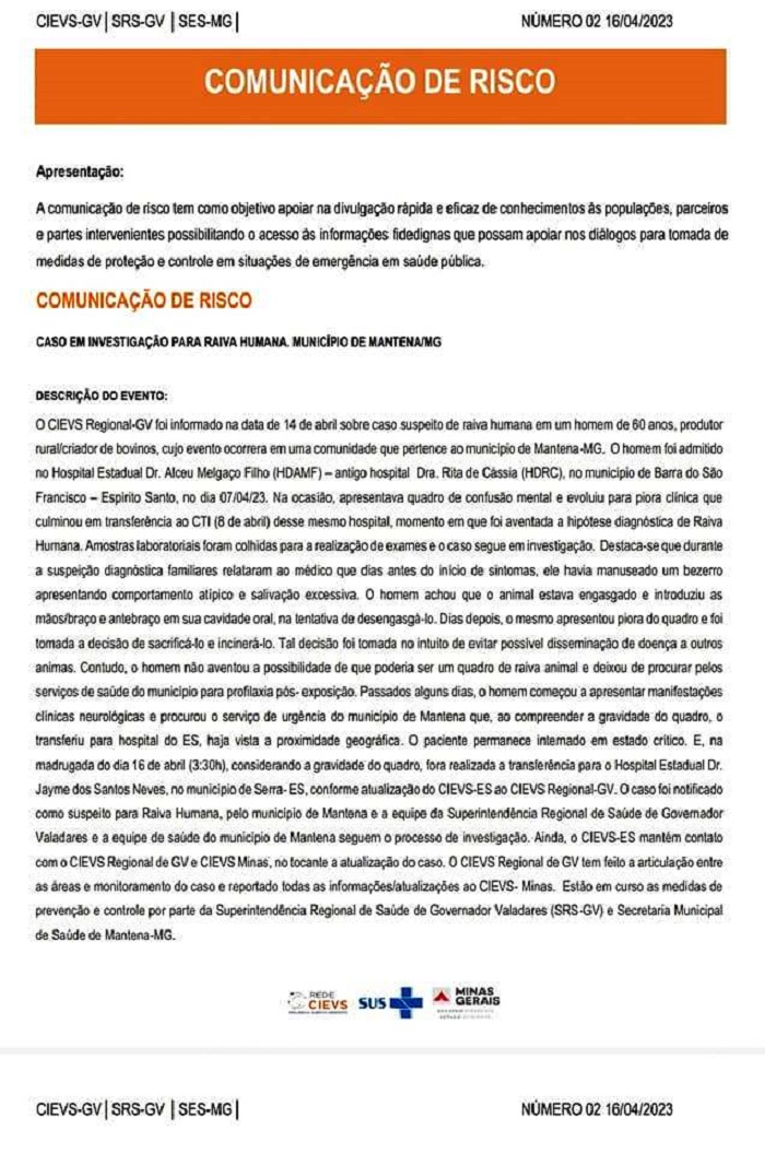 No Brasil, o principal animal que transmite a raiva ao homem é o cão, o morcego hematófago é também  um importante transmissor da Raiva. Autoridades continuam se manifestando sobre o possível e provável  caso de investigação de raiva humana  no Munícipio  de  Mantena e  pelas Redes Sociais população lembra dos pedidos que foram realizados ao Poder Executivo para que retirassem  os inúmeros   animais soltos das  ruas de Mantena.