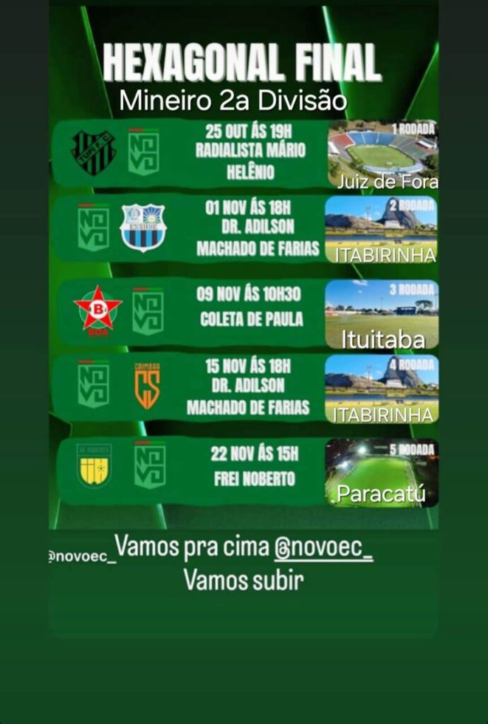 A Federação Mineira de Futebol (FMF) divulgou a tabela do Hexagonal Final da Segunda Divisão do Campeonato Mineiro. A primeira rodada está marcada para dias 25 e 26 de outubro. A última rodada será no dia 22 de novembro com todos os jogos às 15h. Disputam a fase decisiva Boa Esporte, Coimbra, Tupi, Novo Esporte, Paracatu e Essube. As seis equipes jogam entre elas em confrontos de turno único.