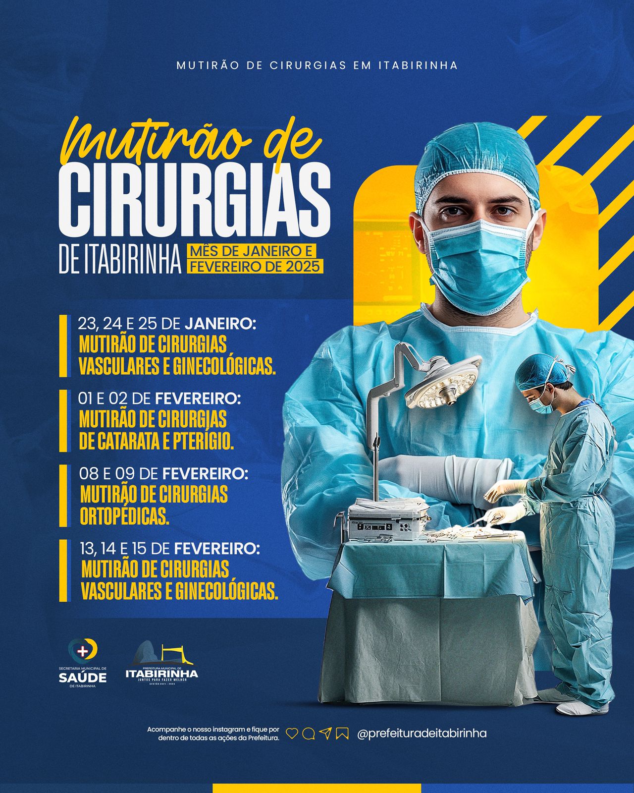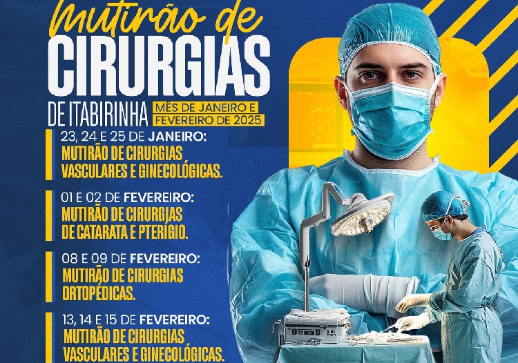 A Prefeitura Municipal de Itabirinha, através da Secretaria Municipal de Saúde e do  Hospital São Lucas, confirmou as datas para agendamento do Mutirão de Cirurgias para os meses de janeiro e fevereiro/2025. Serão realizados Mutirões de Cirurgias:  (vasculares e ginecológicas nos dias 23,24, e 25 de janeiro); (de Catarata e pterígio nos dias 01 e 02 de fevereiro);  (cirurgias ortopédicas nos dias 08 e 09 de fevereiro) e (vasculares e ginecológicas nos dias 13,14,15 de fevereiro). Faça o seu agendamento…